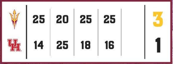 Houston jumped out to a 3-1 lead to start the second frame. Another run of three for the Cougars made it 9-5. The Sun Devils cut into the lead by scoring three in a row with two kills from Miller, making it an 11-9 deficit. After some back and forth, Houston notched four-straight points to push its lead to 18-12, forcing an ASU timeout. Down 23-17, Sydney Henry served the Sun Devils to a 3-0 run to bring out a Cougar timeout. The comeback effort came up short, Houston winning 25-20.