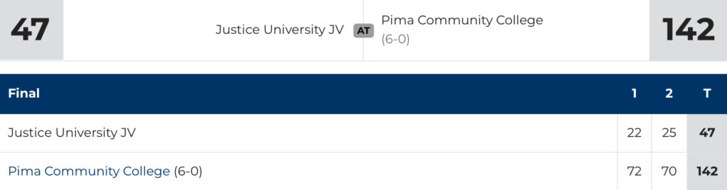 The Pima bench scored 59 points. Sophomore Ky Green led the way with 20 points while freshman Rowan McKenzie (Boulder Creek HS) had 17 points. Sophomore Brock Mendoza added 15 points.