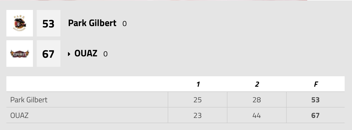(Surprise, AZ)  The Park University Gilbert men’s basketball team (5-6, 0-2) lost to the Ottawa University Arizona Spirit (5-5, 1-3) by a score of 67-53, Thursday night at Faith Arena.