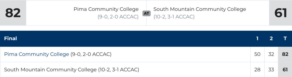 (Phoenix, AZ) The Pima Community College men’s basketball team (9-0, 2-0 in ACCAC) handed South Mountain Community College its first ACCAC conference loss of the season (10-2, 3-1) and remained undefeated after Wednesday’s game in Phoenix.