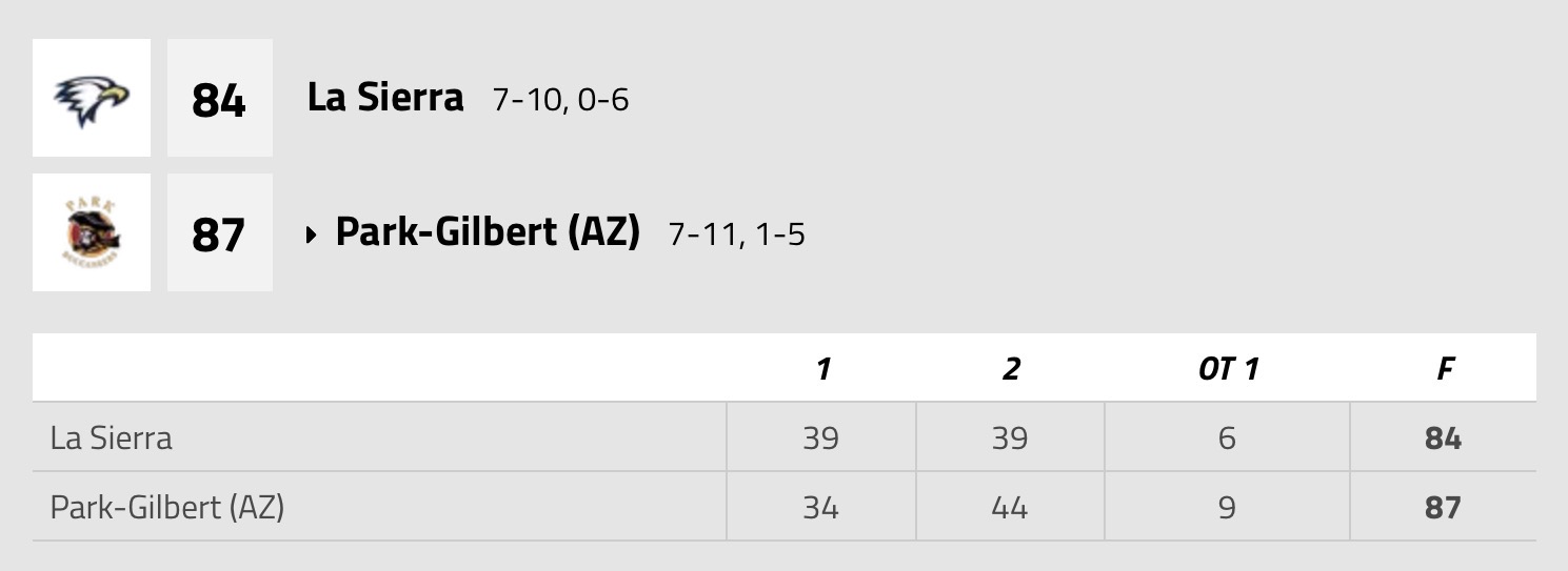 (MESA, AZ) The Park University Gilbert men’s basketball team (7-11, 1-5) defeated the La Sierra University Golden Eagles (7-10, 0-6) by a score of 87-84, Tuesday evening at Arizona Athletic Grounds.