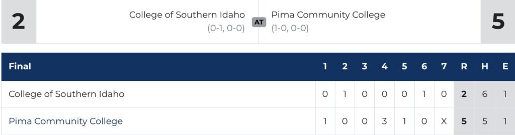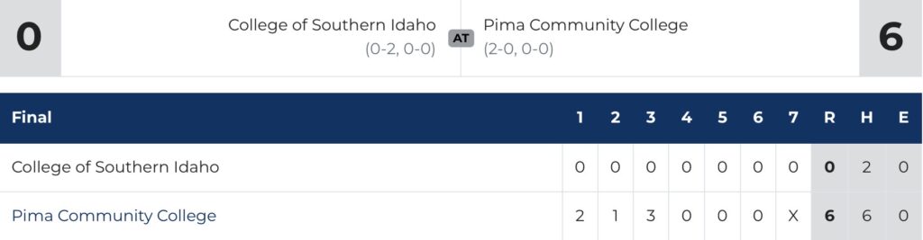 (Tucson, AZ) The Pima Community College baseball team (2-0) opened the 2026 season on Friday as it hosted a doubleheader against the College of Southern Idaho at the West Campus Aztec Baseball Field.