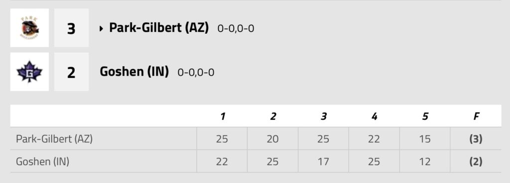 Match 1 – Park Gilbert 3, Goshen 2 (25-22, 20-25, 25-17, 22-25, 15-12)