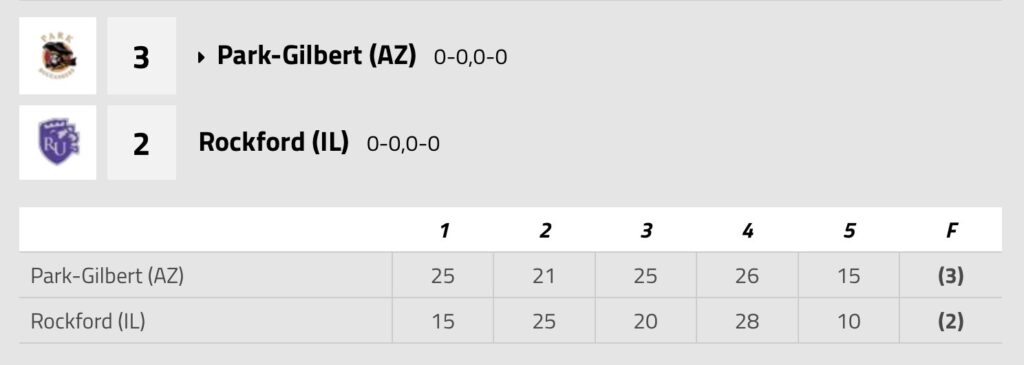 Match 2 – Park Gilbert 3, Rockford 2 (25-15, 21-25, 25-20, 26-28, 15-10)