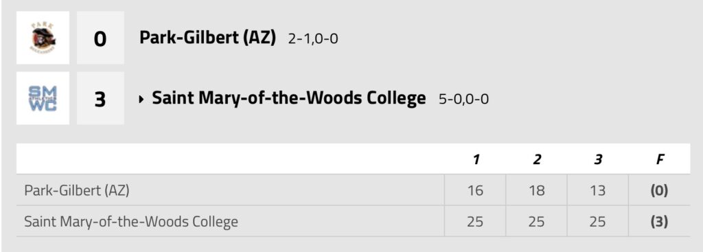 Match 3 – Saint Mary-of-the-Woods 3, Park Gilbert 0 (16-25, 18-25, 13-25)