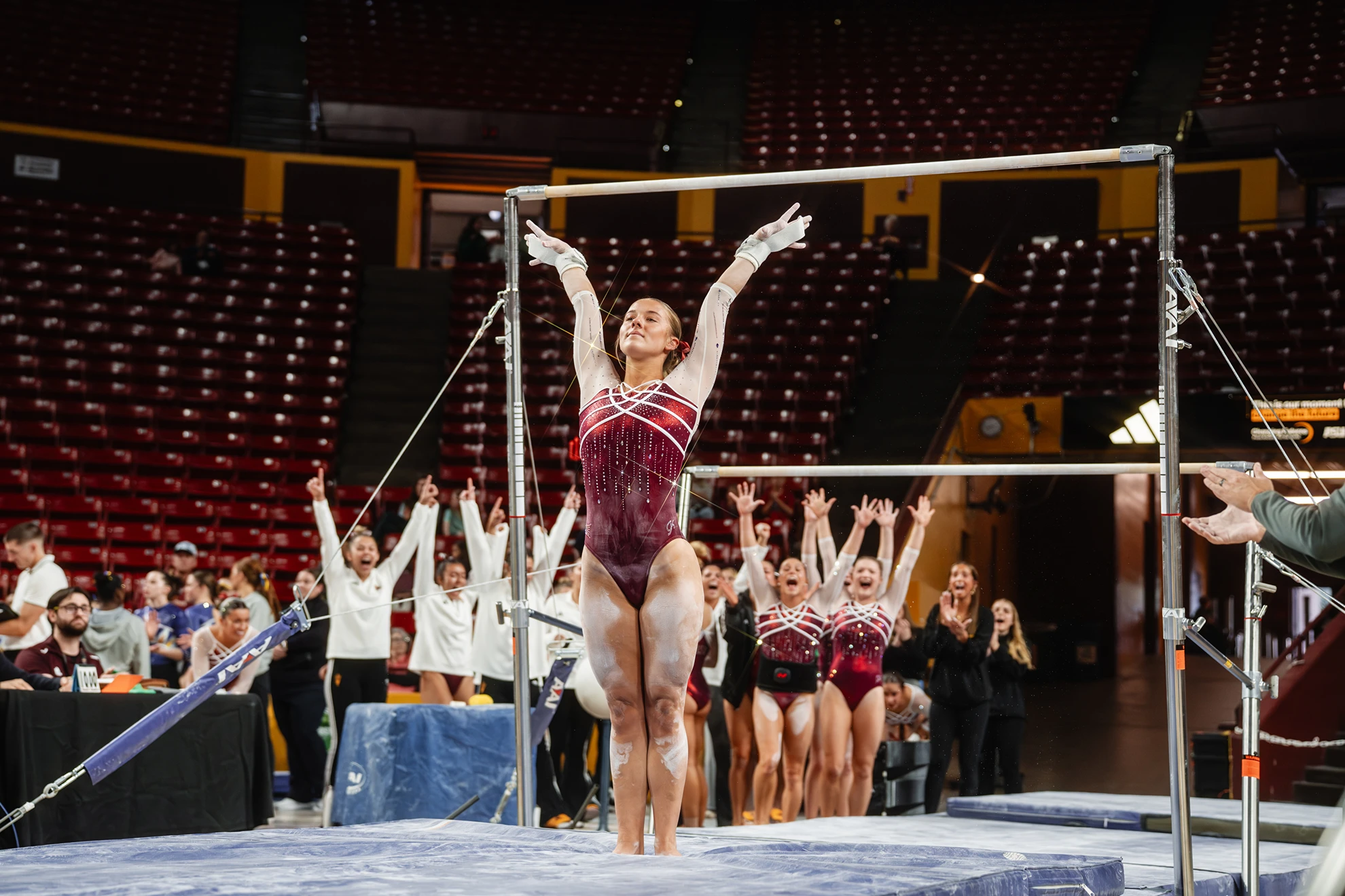 Bromley earned an event high of 9.875 after a struggling start on floor for ASU. The positive momentum continued with Gregoire earning a 9.825 and Smith tying Bromley’s event high of 9.875, securing the event win for the Sun Devils.