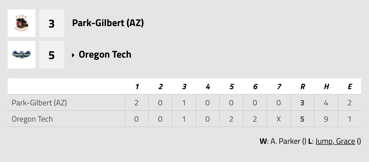The Bucs put a pair of runs on the board in the top of the first inning, courtesy of a wild pitch and a stolen base. Park-Gilbert then took a 3-0 lead when the bases were loaded, and designated player Bri Titus was hit by a pitch. OIT then scored five unanswered runs and took a 5-3 win. The Owls scored one run in the bottom of the third, two runs in the bottom of the fifth, and another two in the bottom of the sixth.