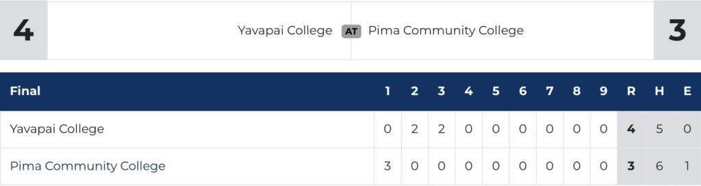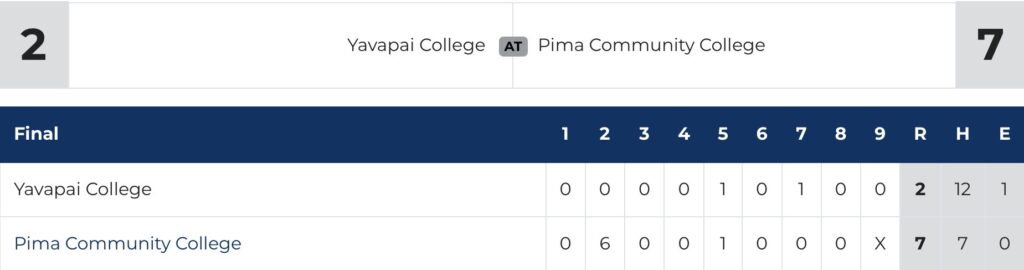 (Tucson, AZ) The Pima Community College baseball team (6-1) closed out its three-game series with Yavapai College on Saturday at the West Campus Aztec Field.