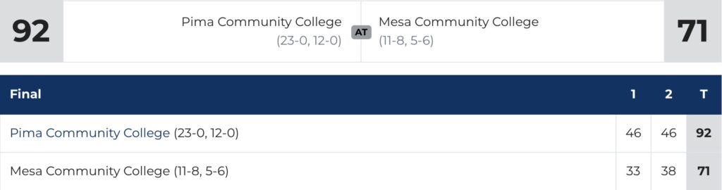 (Mesa, AZ) The Pima Community College men’s basketball team (23-0, 12-0 in ACCAC) won its 23rd straight game on Saturday after a road test at Mesa Community College (11-8, 5-6).