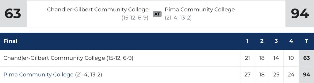 (Tucson, AZ) The Pima Community College women’s basketball team (21-4, 13-2 in ACCAC) earned its ninth straight win on Saturday as it hosted Chandler-Gilbert Community College (15-12, 6-9) at the West Campus Aztec Gymnasium.