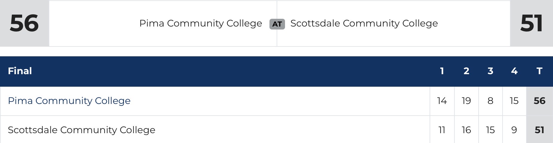 The Aztecs won the first two quarters taking a 33-27 lead at the break, but the Artichokes outscored the Aztecs 15-8 in the third quarter. Pima trailed 42-41 entering the fourth quarter. The Aztecs countered by outscoring the Artichokes 15-9 to end the game.