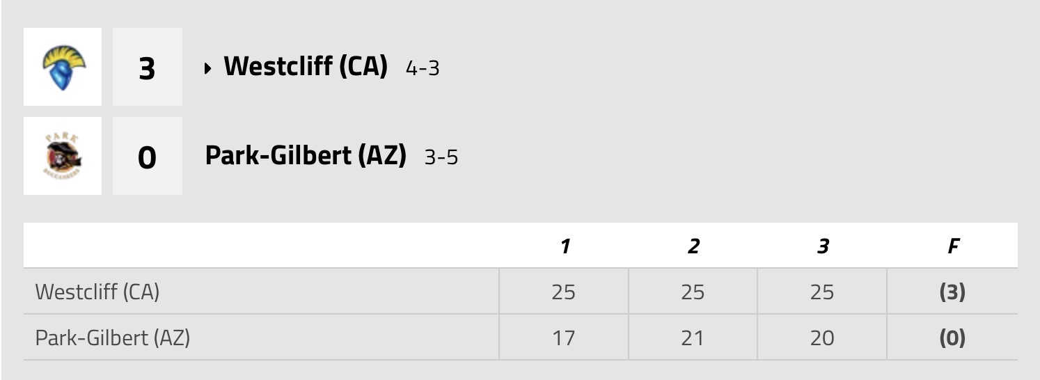 (Mesa, AZ) The Park University Gilbert men’s volleyball team lost to No. 14 Westcliff this afternoon 3-0 (17-25, 21-25, 20-25) at Arizona Athletic Ground. The Bucs fall to 3-5 on the season while the Warriors up their record to 4-3.