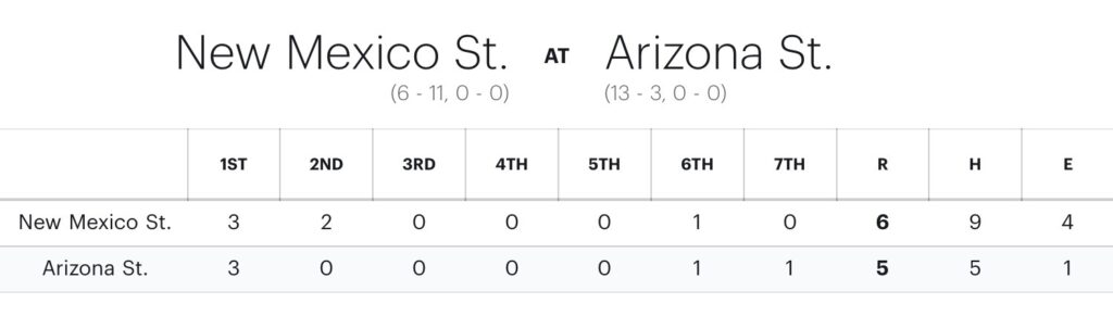 The Aggies extended their lead out to three with a leadoff solo home run to start the sixth, but the Sun Devils managed to put one run back on the scoreboard in the bottom of the sixth when Yannixa Acuña scored on a NMSU fielding error off the bat of JazMarie Roberts.