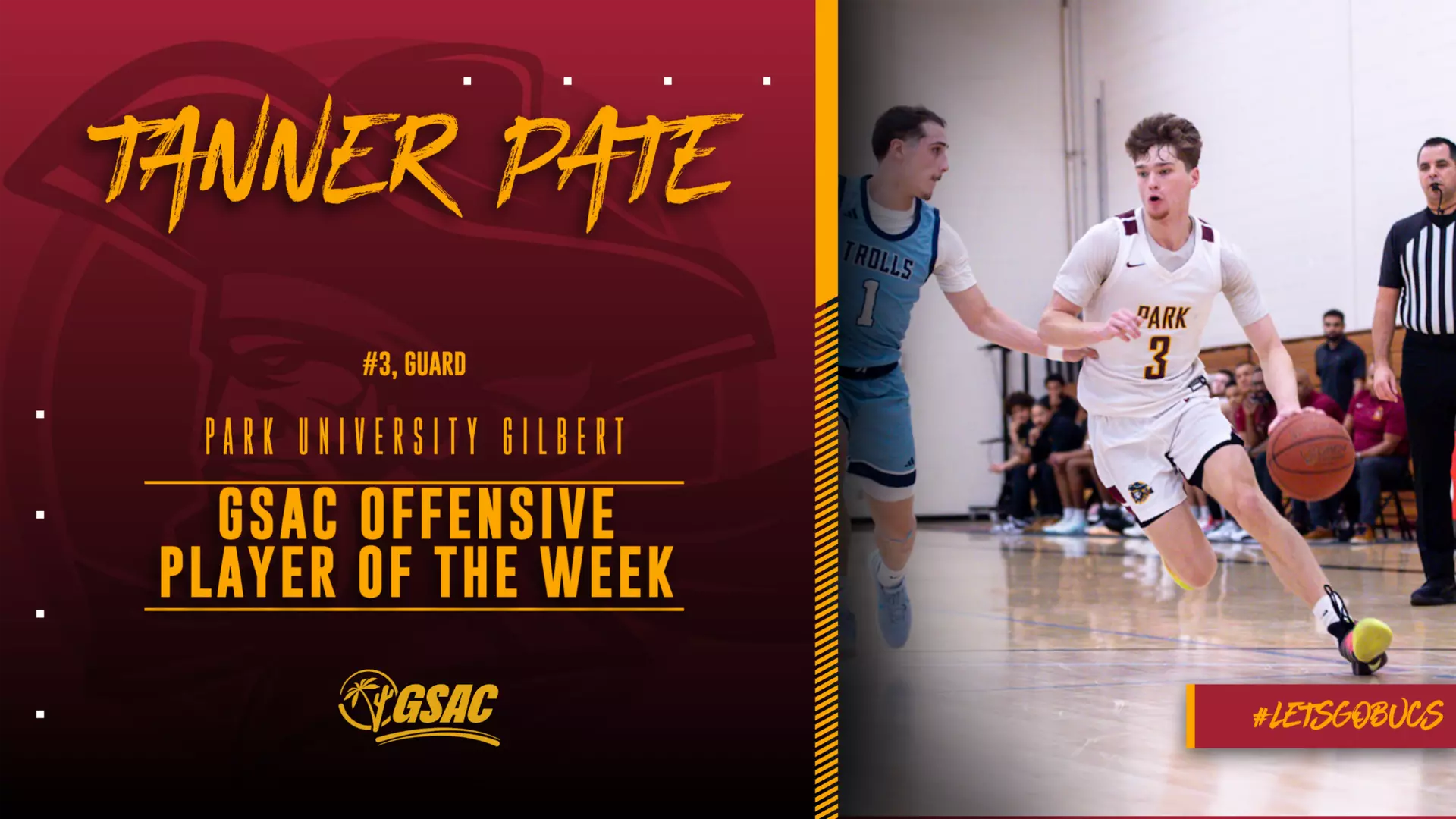 (Aliso Viejo, CA)  The Great Southwest Athletic Conference announced its winners for men’s basketball conference players of the week presented by Athletic Solutions on Monday afternoon, tabbing Park University Gilbert’s own Tanner Pate as the GSAC Offensive Player of the Week.