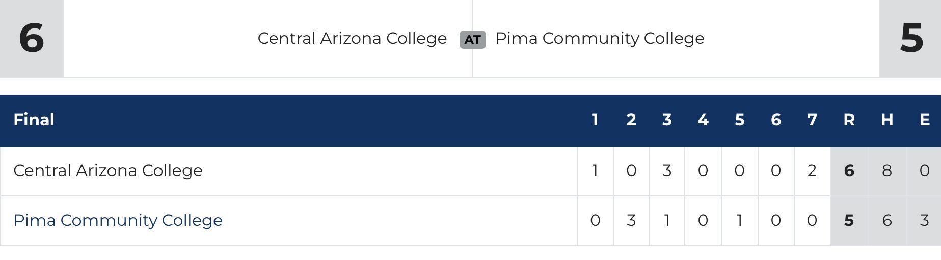Game 1: (25) Central Arizona Vaqueros 6, (21) Pima Aztecs 5