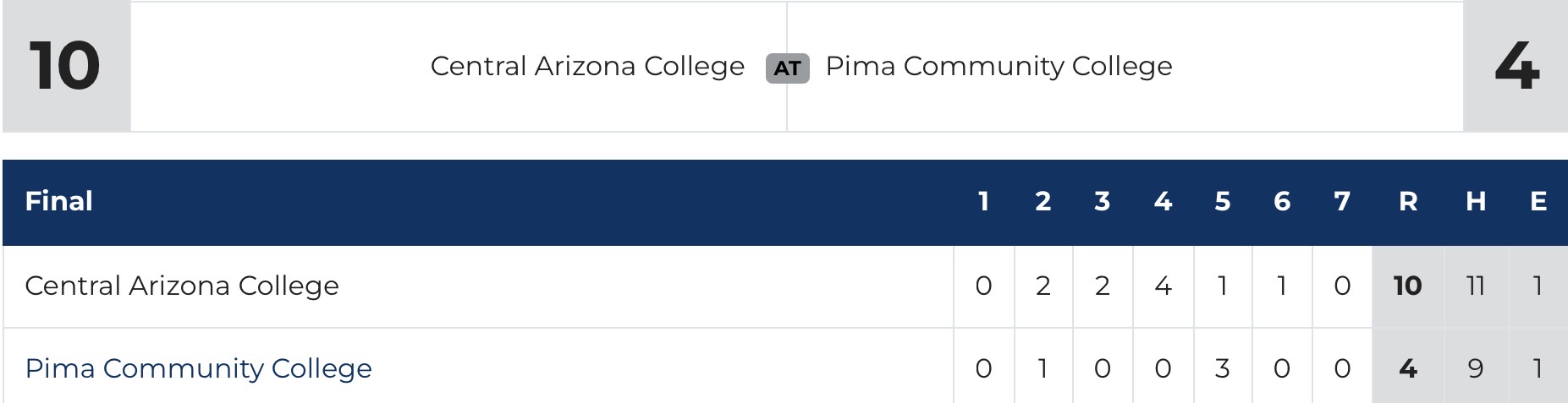 Game 2: (25) Central Arizona Vaqueros 10, (21) Pima Aztecs 4
