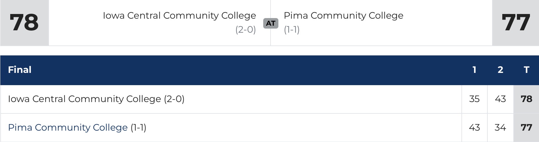 The game featured 13 ties and 13 lead changes. Iowa Central went on an 11-0 run early in the first half to take a 16-11 lead as the Aztecs went scoreless for four minutes until Hunt’s basket made it 16-13 with 12:10 left in the half. The Aztecs retook the lead at 31-30 after freshman Isaiah Hill’s (Premier Prep Academy) score with 4:31remaining. They maintained a slim lead as freshman Gerron Graham (Premier Prep Academy) and Johnson scored the final four points of the half to give Pima their biggest lead at 43-35.