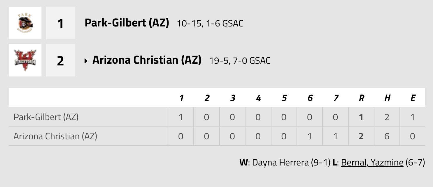 Game 1 proved to be a pitching battle between Park-Gilbert’s Yazmine Bernal (6-7) and Arizona Christian’s Dayna Herrera (9-1). Hererra and Bernal have thrown the first and the third most strikeouts in the GSAC this season, with 57 and 45 respectively.