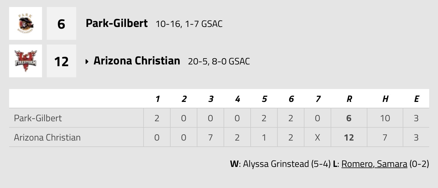 (Glendale, AZ)  The Park University Gilbert softball team (10-16, 1-7) dropped a pair of games to the Arizona Christian University Firestorm (20-5, 8-0), Thursday evening at the ACU Softball Field.