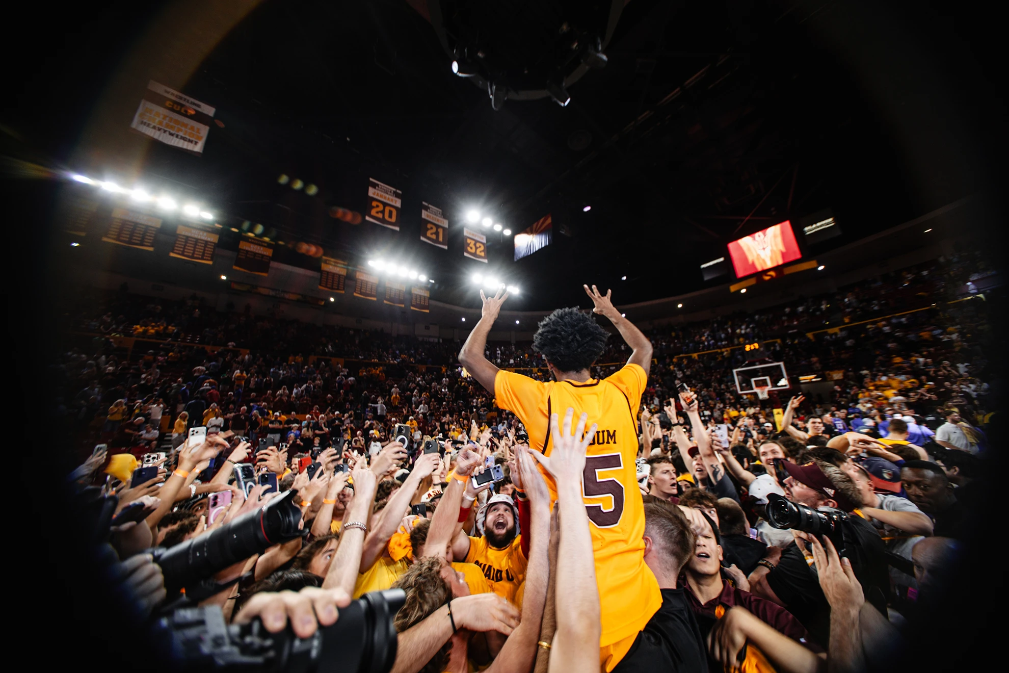 Moe Odum raises the pitchfork as he is being elevated by the crowd after Sun Devil Men's Basketball defeated No. 14 Kansas on Tuesday, March 3 at Desert Financial Arena.