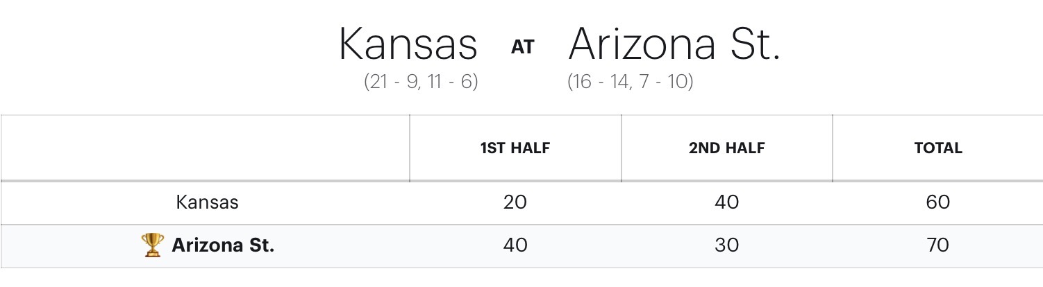 The Sun Devils (16-14, 7-10) upended the Jayhawks (21-9, 11-6), 70-60, thanks to a brilliant defensive effort and a two-headed monster on offense. Arizona State led for 39:17 of a possible 40 minutes of action, thoroughly outplaying the visitors from Lawrence for the entirety of the contest. Head Coach Bobby Hurley has now won four consecutive home games despite facing a difficult Big 12 league slate. This is his 15th win over a ranked team during his 11-year tenure and the 9th over a Top-15 team.