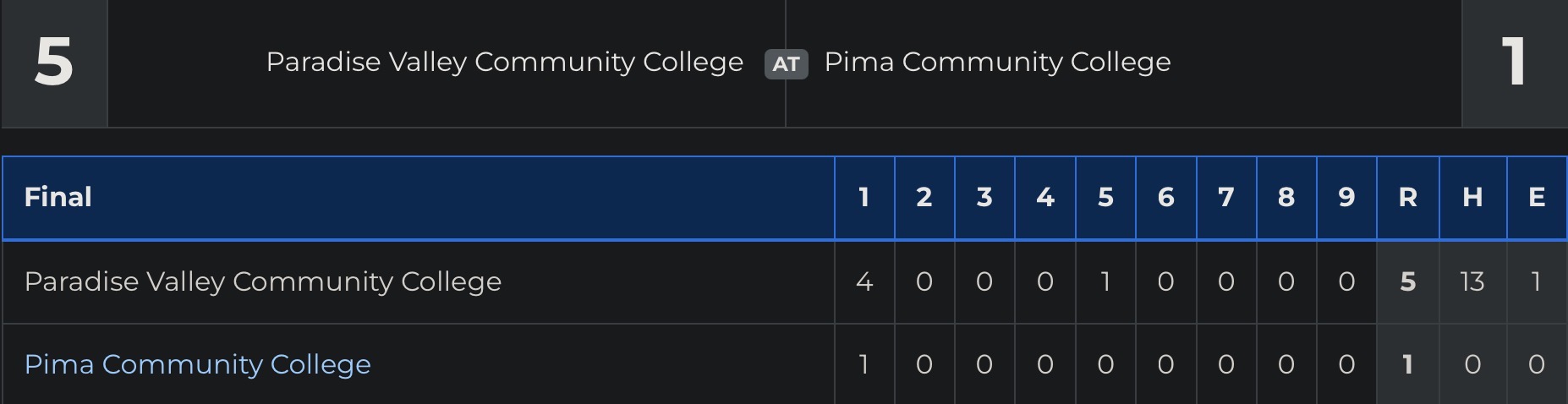 (Tucson, AZ)  The Pima Community College baseball team (23-24, 15-19 in ACCAC) struggled on offense in its ACCAC conference game against Paradise Valley Community College (22-28, 14-20) on Tuesday at the West Campus Aztec Field.