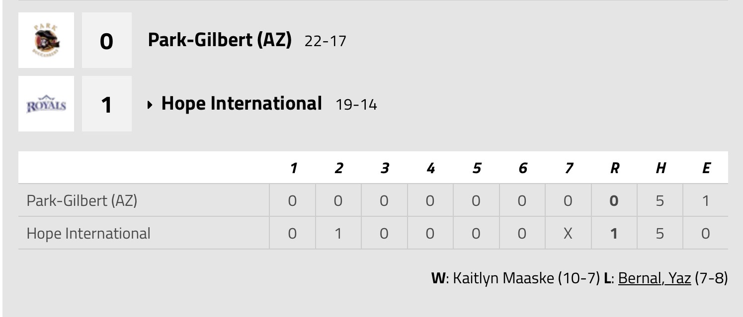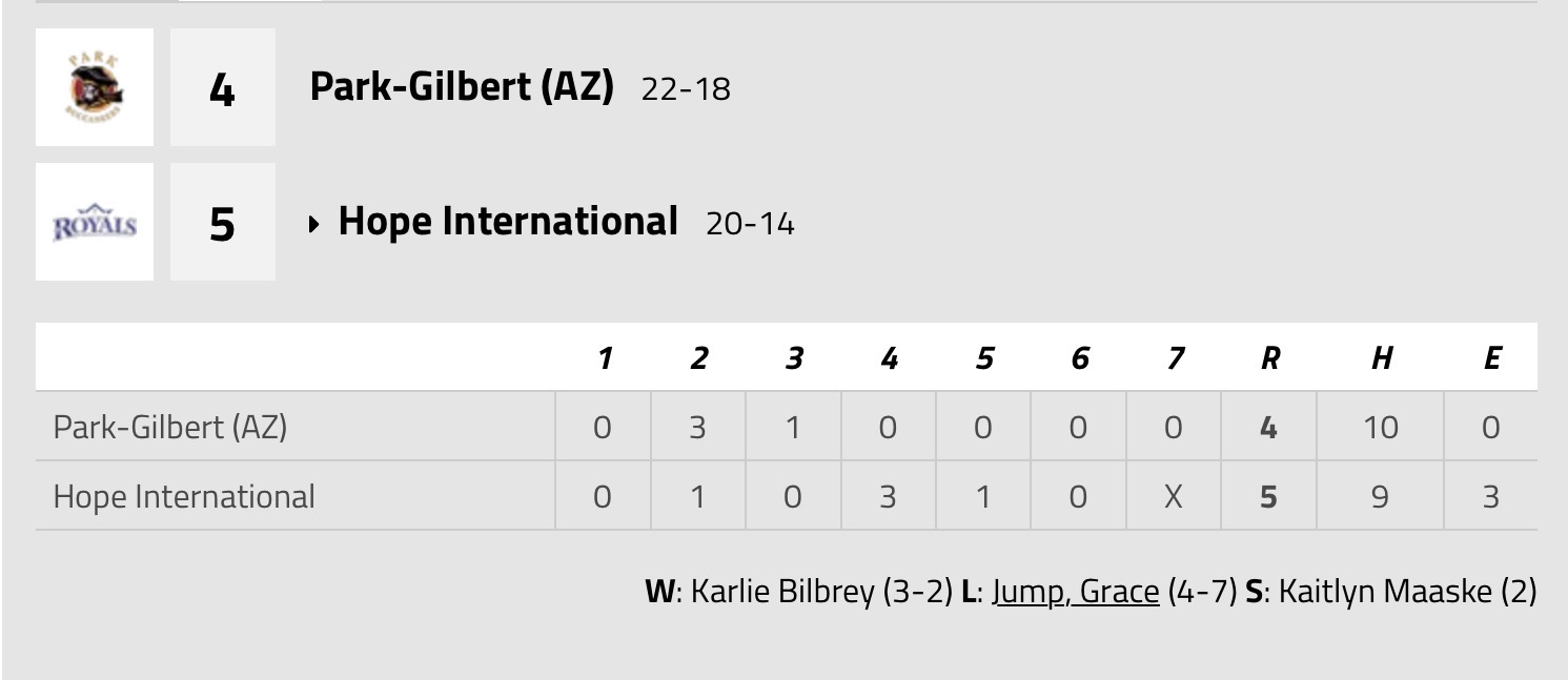 (Fullerton, CA) The Park University Gilbert softball team (22-18, 5-9) dropped a pair of Great Southwest Athletic Conference games to the Hope International University Royals (20-14, 7-7), Friday afternoon at Bastanchury Park.